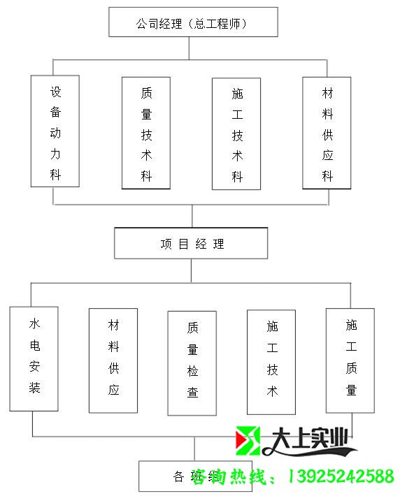 根據工程規模、特點,本工程按項目管理法施工,選派有施工管理經驗的管理人員當項目經理,挑選有施工經驗的技術人員組建項目部,組成精銳強悍的建筑隊,各司其職,各盡其能,上下協調,群策群力,精心施工,圓滿完成施工任務,施工管理機構名單詳見:施工管理機構組織網絡。