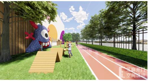 園區戶外設計中將音樂元素和涂鴉藝術融合,藝術造型配上五彩斑斕的童趣色彩,調皮而又靈動。“紅黃藍”三色籃球場極其奪目,讓孩子們對色彩的認知融入到運動娛樂之中。
