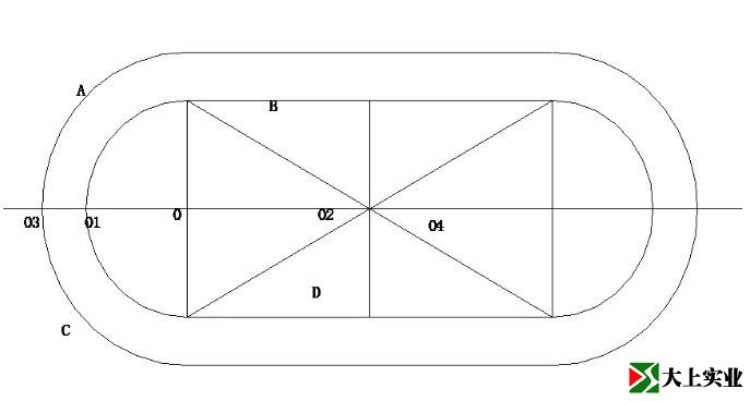 定位基樁:依原有建筑單位測量標定的提控制點,設(shè)置基準樁(A、B、C、D、0、01、02、03、04)。其中01、02測量基樁要按照永久性標志設(shè)置,用砼澆搗并加保護,以免施工過程中碰撞移位。A、B、C、D這四個點是足球場、跑道放樣劃線的依據(jù),0、01、02、03、04是環(huán)溝、跑道的放樣依據(jù)。平面位置見設(shè)計圖,A、B、C、D四角定位樁閉合后角度誤差不得超過6〞,如下圖: