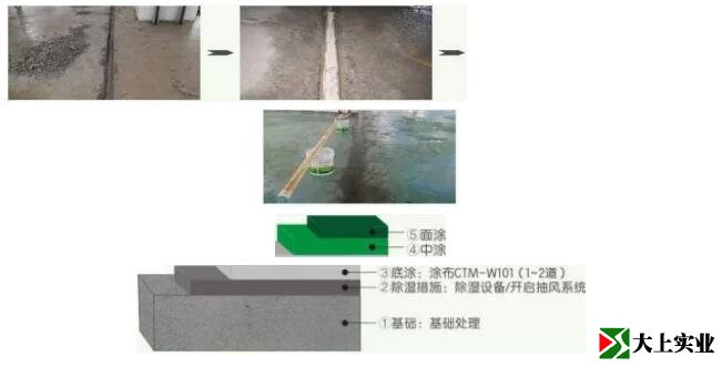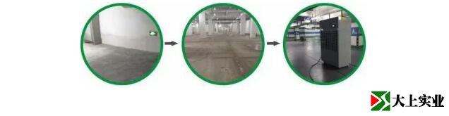 開啟抽風系統/除濕設備至空氣濕度達到施工面漆的要求,完成除濕工作(空氣濕度需<80%,地面含水率需<6%)