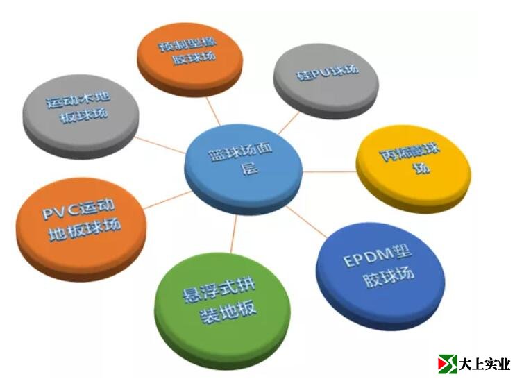 大上實業小編就通過一張圖介紹籃球場面層材料的分類,再詳細論述各種材料面層的特點,讓您對如何選擇籃球場面層材料做到心中有數。羽毛球場、排球場等也可參照這些標準選擇。