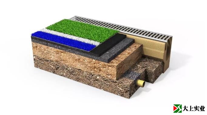此外,在運(yùn)動(dòng)場表層需要設(shè)置一個(gè)排水口。在端線后面,有3米寬的人造草坪緩沖區(qū),2米寬的空白區(qū),這部分通常是鋪砌地面。在邊線的后面,除了1米的排水區(qū)外,建議再增加3米的人造草坪緩沖區(qū)。