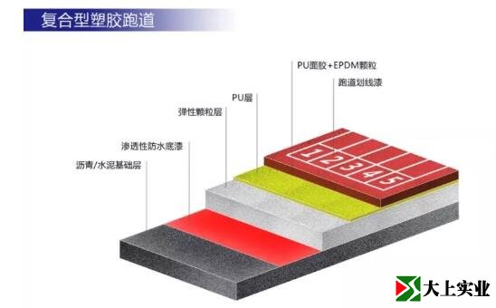復合塑膠跑道材料采用兩層粘接劑,底層與透氣跑道相同,彈性橡膠粒子和聚氨酯膠粘劑通過鋪裝設備制成緩沖彈性層,厚度約10 mm,表層膠粘劑鋪設2~3mm厚的聚氨酯砂漿,EPDM橡膠顆粒作為磨損表層。基層是由單組分膠黏劑和彈性橡膠顆粒結合而成的,這是一種環保的產品。具有透氣功能,在高溫下,地基產生的蒸汽釋放很快,蒸汽壓力不能積聚,不會產生氣泡現象,滿足專業要求,彈性好。EPDM顆粒被用于表面層,使其具有較高的抗紫外線能力。實踐證明,它可以使用十多年,不會褪色。