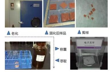 按照推薦性國(guó)家標(biāo)準(zhǔn)《合成材料跑道面層》對(duì)送檢試樣的要求,樣品應(yīng)在固化14天后進(jìn)行測(cè)試.因事情緊急,為更客觀地檢測(cè)操場(chǎng)情況,將樣品放入烤箱加速其固化,剪樣、稱重、萃取。