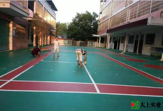從10月1號勘察場地開始動工到完工結(jié)束,整個工程,建筑工人共花10天左右時間。首先本項目的工程師傅對操場的水泥地面進行了打磨、清洗、伸縮縫的處理;然后5次對場地涂刮硅PU膠,包括場地補平、底層、彈性層、加強層、面層的刮膠處理;最后在場地表面劃彩線,迅速把操場布置成一個標準漂亮的排球場和羽毛球場,連學(xué)生做操的站立位置也一一標明。