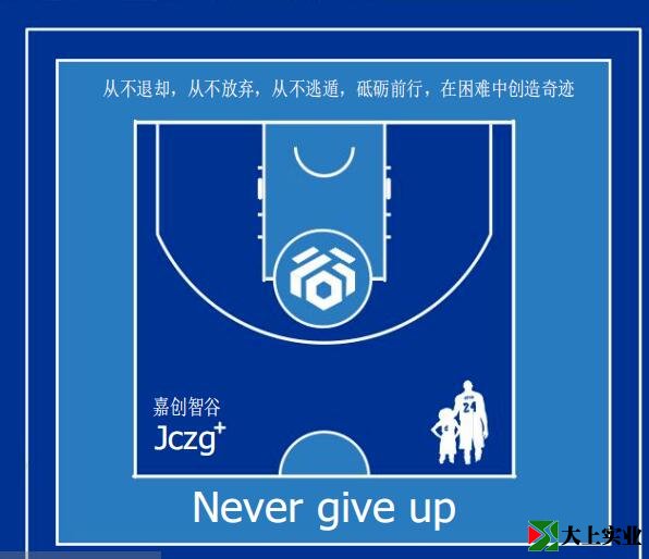 球場中間是嘉創智谷的園區Logo,正前方噴涂著“嘉創人”追求的企業精神:從不退卻、從不放棄、從不逃遁、砥礪前行、在困難中創造奇跡。球場后方噴涂著英文“Never give up”(永不放棄)。