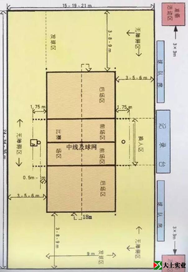 籃球場右面那些中規中矩的矩形框是什么?答:是排球場。排球比賽場區為長18米,寬9米的長方形。接下來小編上一張非常形象的直觀的平面圖為大家解讀。